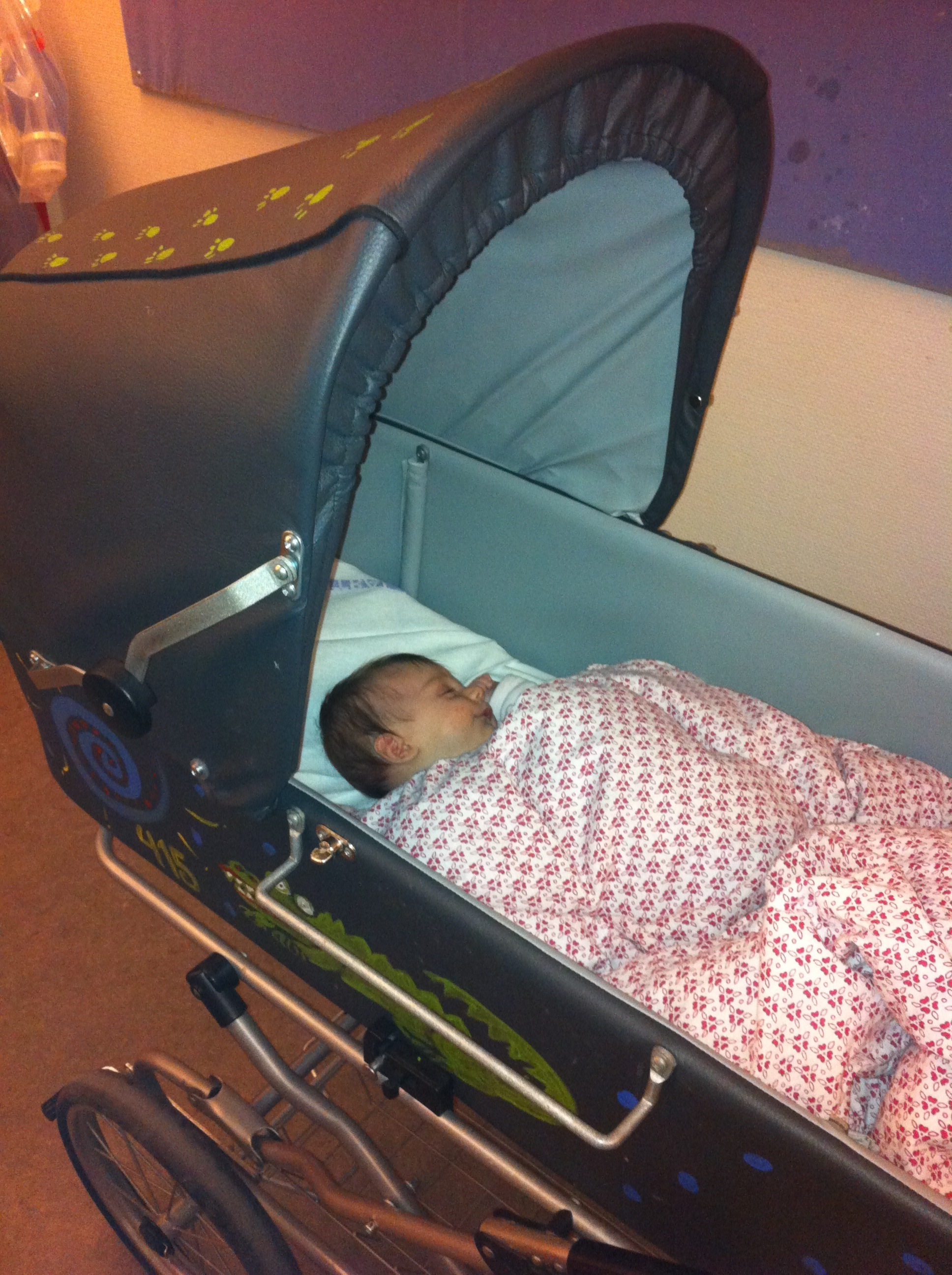I dag har mor og mig været på børneafdelingen på Hvidovre Hospital fordi jeg ikke vil tage så meget på i vægt. Vi kom kl 9.30 og kunne først tage hjem kl. 18. Så kan man godt blive lidt træt, men så var det godt, de havde en lånevogn til mig. Vi blev ikke ret meget klogere af besøget, kun viste en kontrolvejning før og efter mad, at jeg får 85 ml, når jeg spiser, og det er rigeligt. Men som lægen sagde: “måske skal hun bare ikke være en fed baby”.