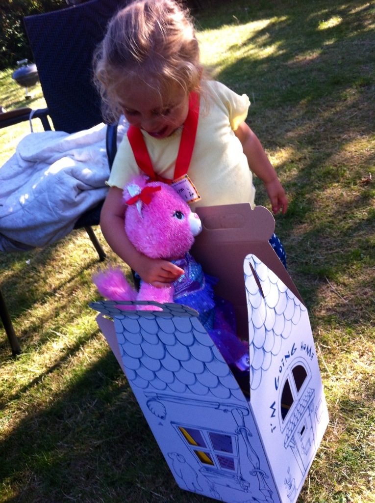 I dag blev fødselsdagspenge vekslet til en build-a-bear. Jeg vidste præcis, hvad jeg ville ha: bamse, kjole og sko og sløjfer. Far var ikke enig i min smag, men jeg sejrede. Nu går jeg rundt med Kat overalt. Far glæder sig allerede til næste tur!